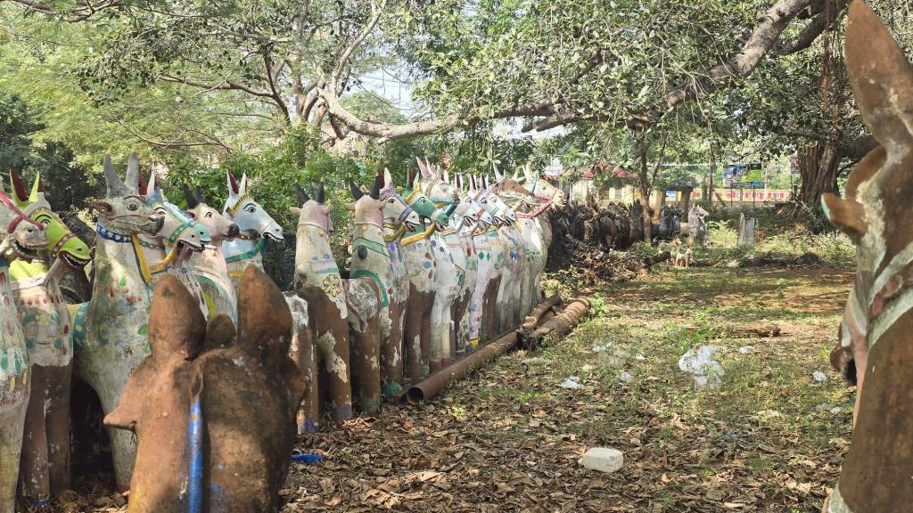 We continue to buy water as we go. We stopped for lunch enroute in a busy cafe. For 4 tasty samosas, 2 litres of water, a coffee and an Indian tea, it cost exactly £1. We cycled past all these clay horses. The are used as part of celebrations at temples.