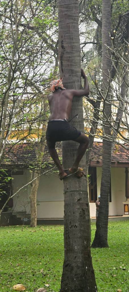 Day 4. A more relaxed day. Only 34 miles to do. We watched them harvest coconuts. All you need is a loop of rope round your ankles and a sharp knife to cut the nuts free -and the skill, strength and years of practice to shin up a vertical palm trunk. Once we were out of town the roads were markedly quieter. For some miles we cycled on the banks of this river which we enjoyed. We saw people making bricks in the age old way, trampling the mud and putting it into a mould, taking it out and leaving it to dry in the sun.